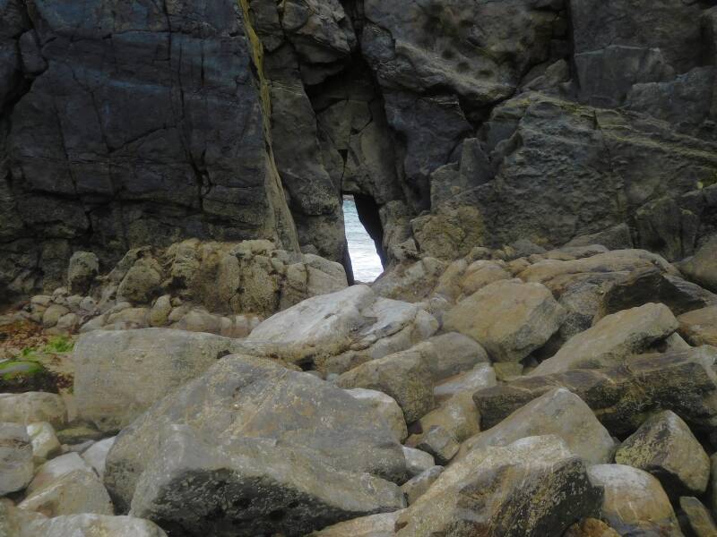 Enkele kilometers verder parkeren we de auto naast de airbase en volgen het pad langs de afrastering. Recht door 5 minuten en dan is rechts de trappen af is een van de 3 Church Doors. De eerste is enorm groot, de tweede, die je kunt zien is door door 1 gaat, heeft geen doorkijk. Hier ook een strand met veel stenen met algen en zeewier erop. Door 3 ligt tegenover de grote en daar pas ik net door. Eenmaal erdoor is er nog een strand voor je alleen.